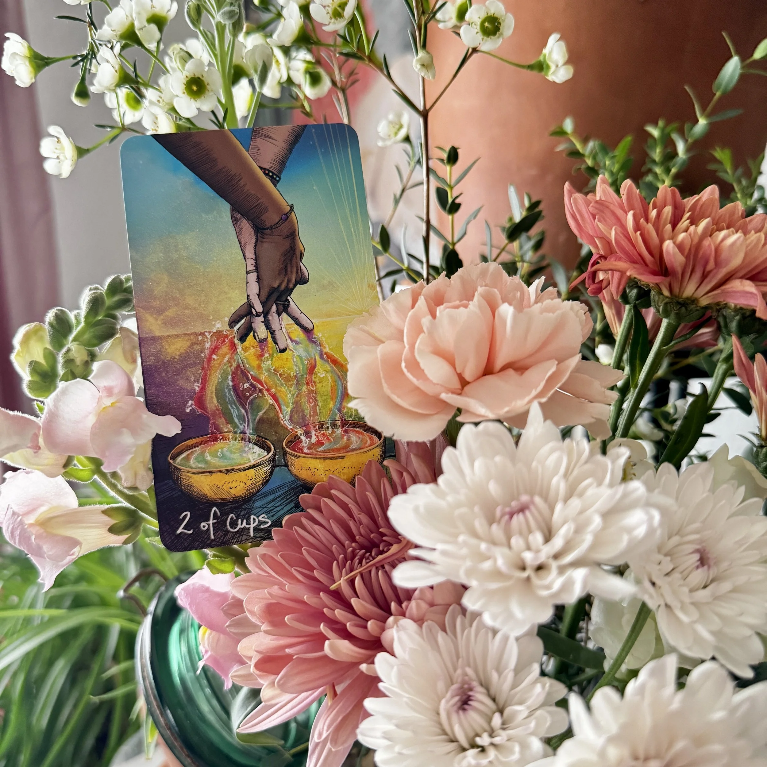 When thinking about Valentine’s day this year, I thought of the holiday through the lens of the tarot and the 2 of Cups flowed into my thoughts, this card is a card of connection, choice, relationship, unity, and balance. Somehow that makes more sense to me at the core of what Valentine’s day is about.