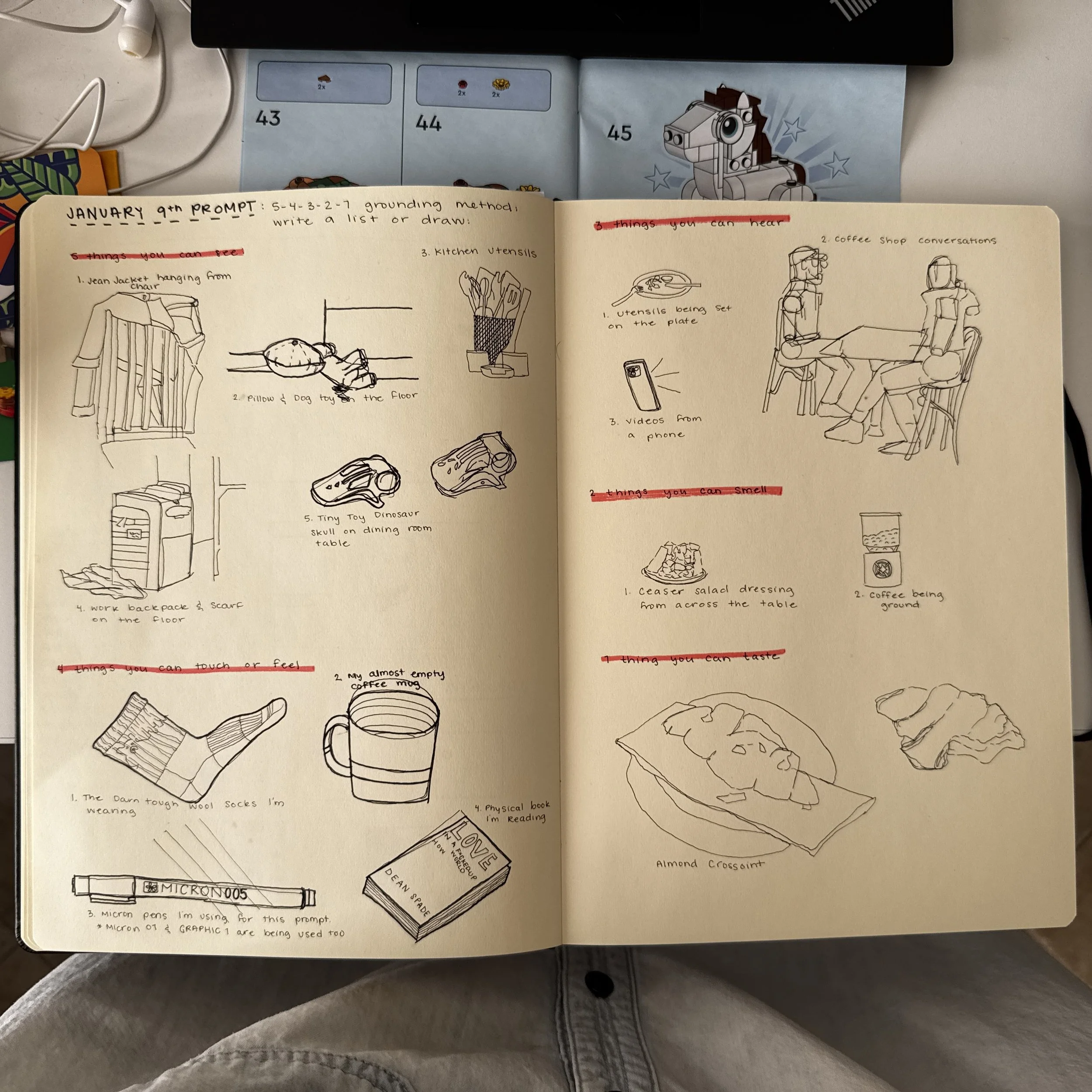I’ve been getting back into a creative routine working through a January creative challenge called 31 days of Creative Resilience from artist Carolyn Yoo. Everyday is a different prompt, and all you need is a sketch book and pen. I was working on a drawing prompt called the 5-4-3-2-1 drawing method. This particular drawing prompt is a play on the 5-4-3-2-1 grounding method.